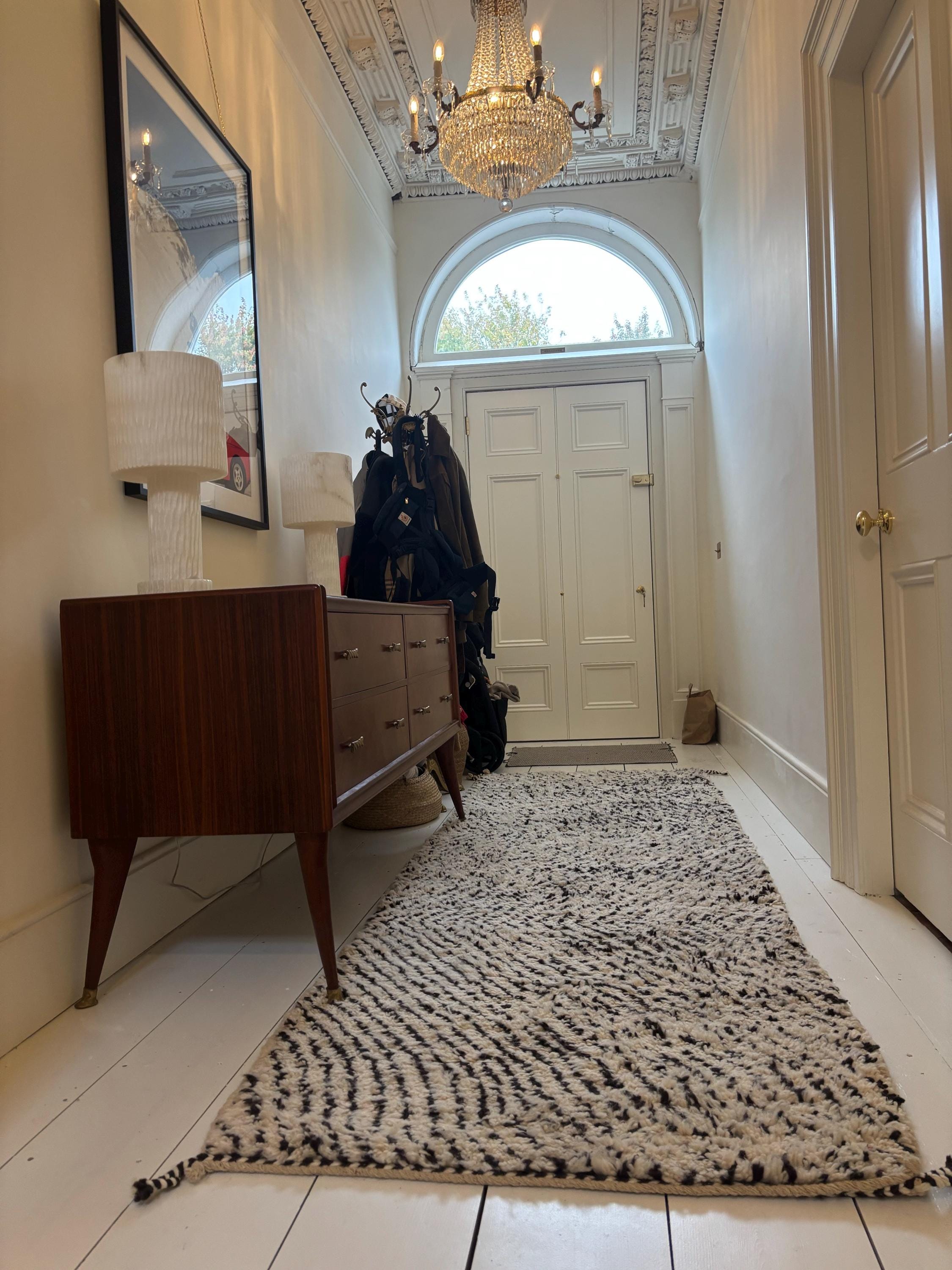 This beautiful and wonderful artistic berber wool rug is hand-woven by Berber women in the Atlas mountains, using techniques that are being passed from generation to generation. This Berber rug is from Ben Ourain tribe.We use undyed natural wool to decorate rugs with traditional geometrical designs. These magnificent and sophisticated Moroccan rugs beautifully connect the ancient history of nomadic Berber tribes with modern-day interiors through fascination. Every rug is entirely handmade and then washed and dried in the mountain air. These rugs go perfectly well with all interior styles, including Traditional, Bohemian, Minimalist, Modern, and Scandinavian, making it the best choice for your needs. Beni Ourain rugs have also been featured on the cover of the world's leading home decoration .