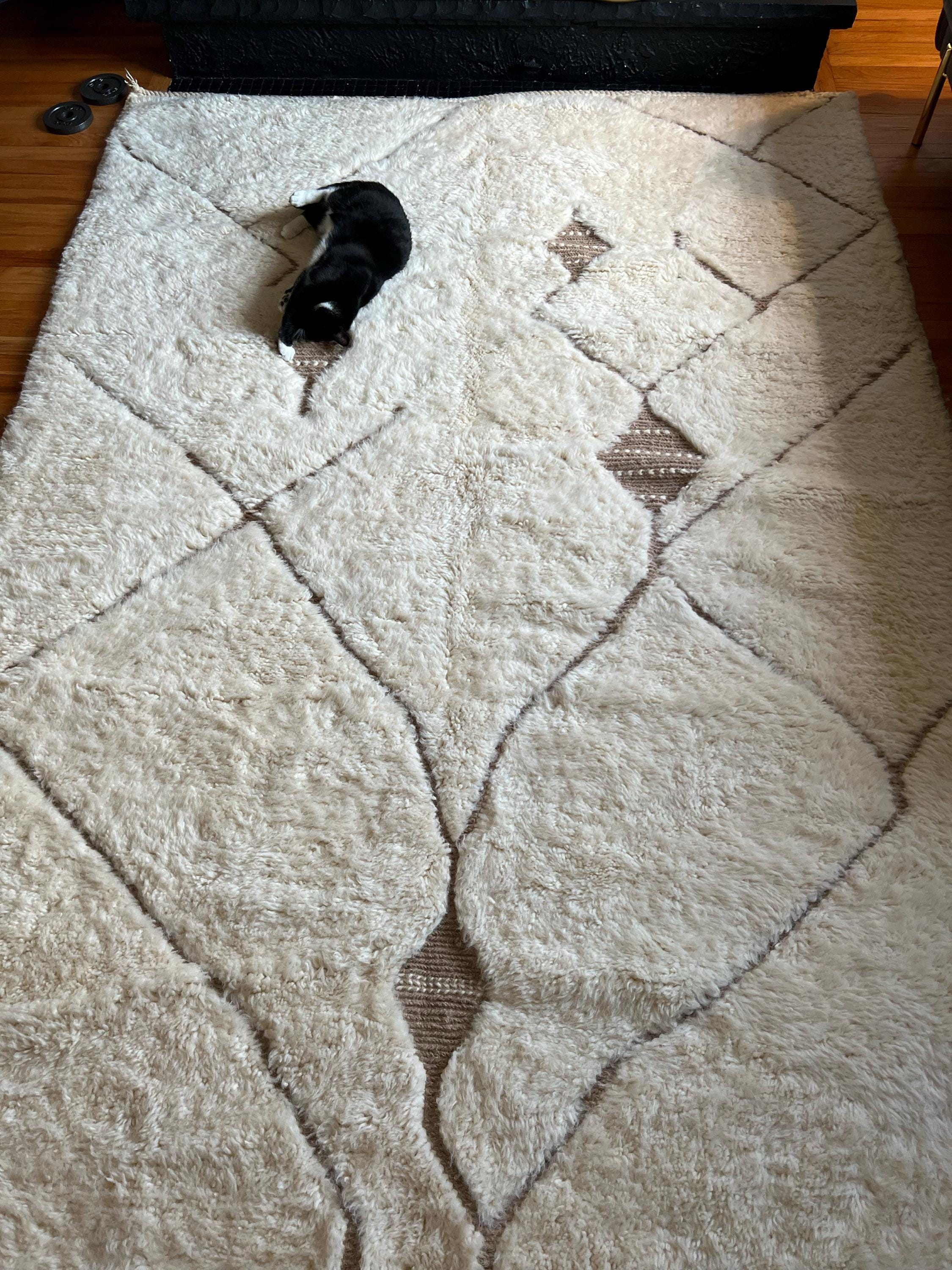 This beautiful and wonderful artistic berber Beige and white wool geometric rug is hand-woven by Our artisans in the Atlas mountains, using techniques that are being passed from generation to generation. This Berber rug is from Ben Ourain tribe.We use undyed natural wool to decorate rugs with traditional geometrical designs. These magnificent and sophisticated Moroccan rugs beautifully connect the ancient history of nomadic Berber tribes with modern-day interiors through fascination. Every rug is entirely handmade and then washed and dried in the mountain air. These rugs go perfectly well with all interior styles, including Traditional, Bohemian, Minimalist, Modern, and Scandinavian, making it the best choice for your needs. Beni Ourain rugs have also been featured on the cover of the world's leading home decoration .