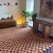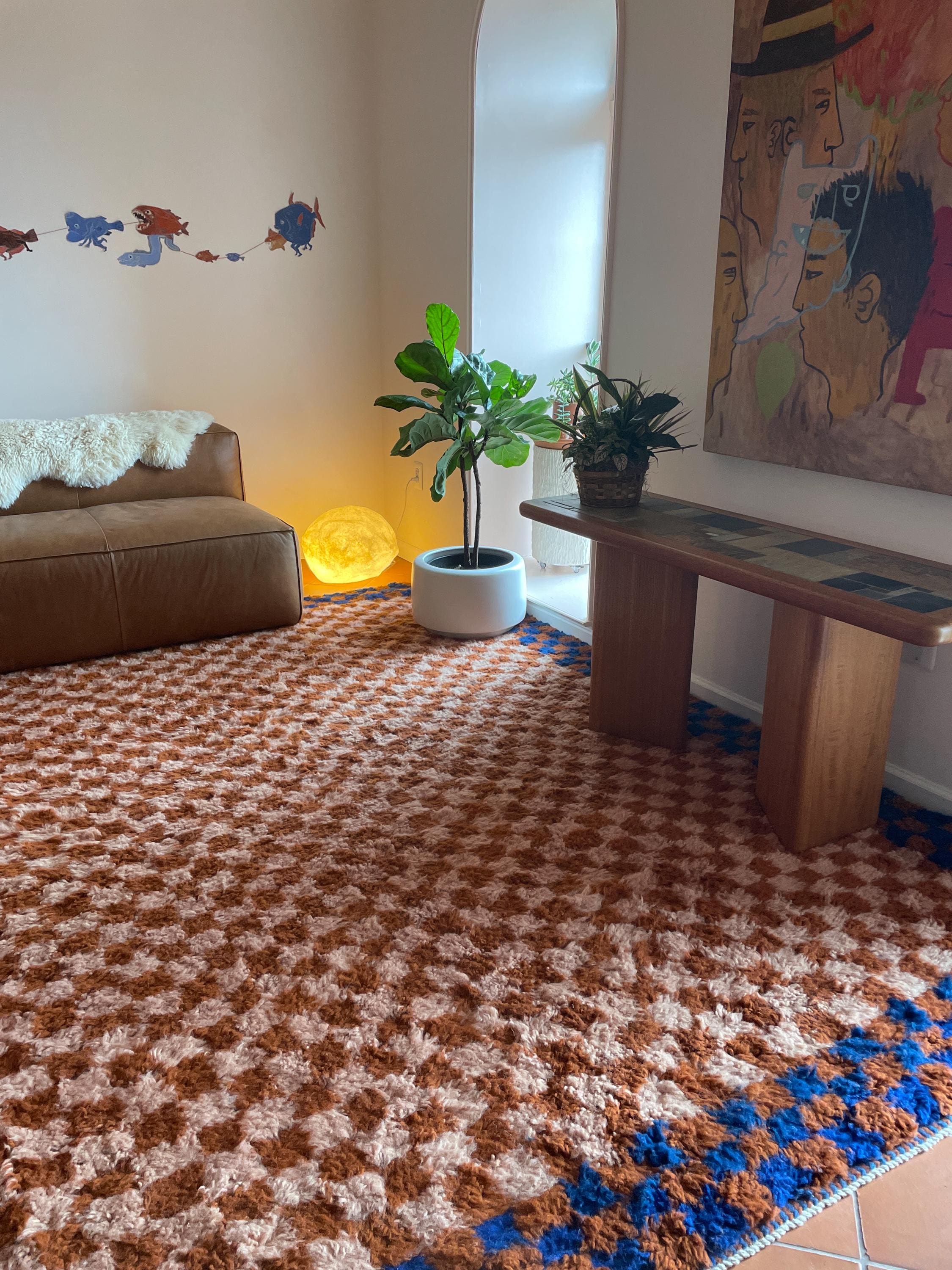 This is a brown and blue checkered Beni Ourain rug, hand-knotted in our workshop in Morocco. The central field is filled with a dense all-over checkerboard in warm terracotta and soft peach, the two tones close in depth but distinct enough to give the pattern real rhythm and movement. A bold blue and terracotta checkered border frames the entire piece on all four sides, sharpening the composition with a strong graphic edge. The overall effect is warm, energetic, and completely confident.