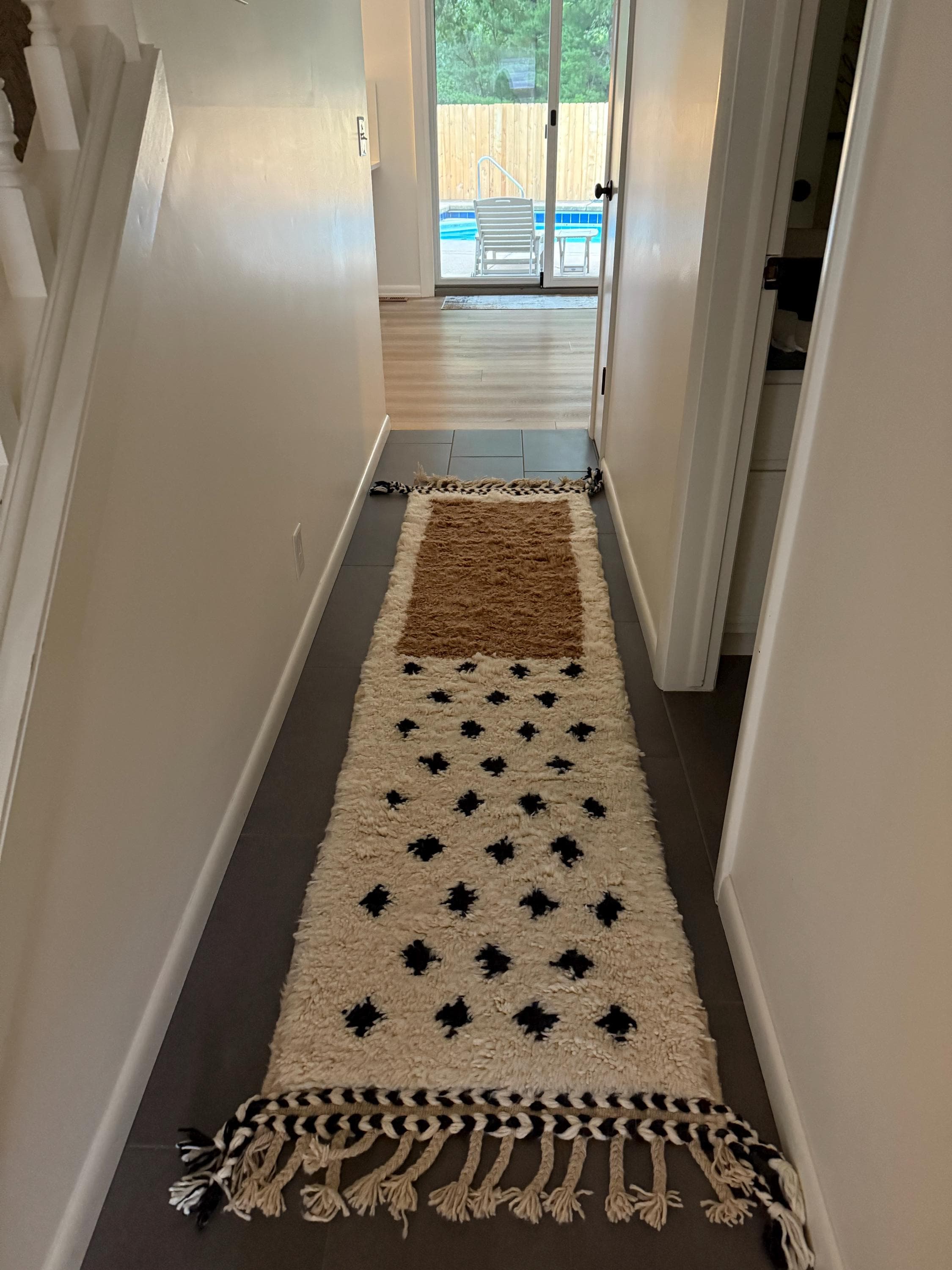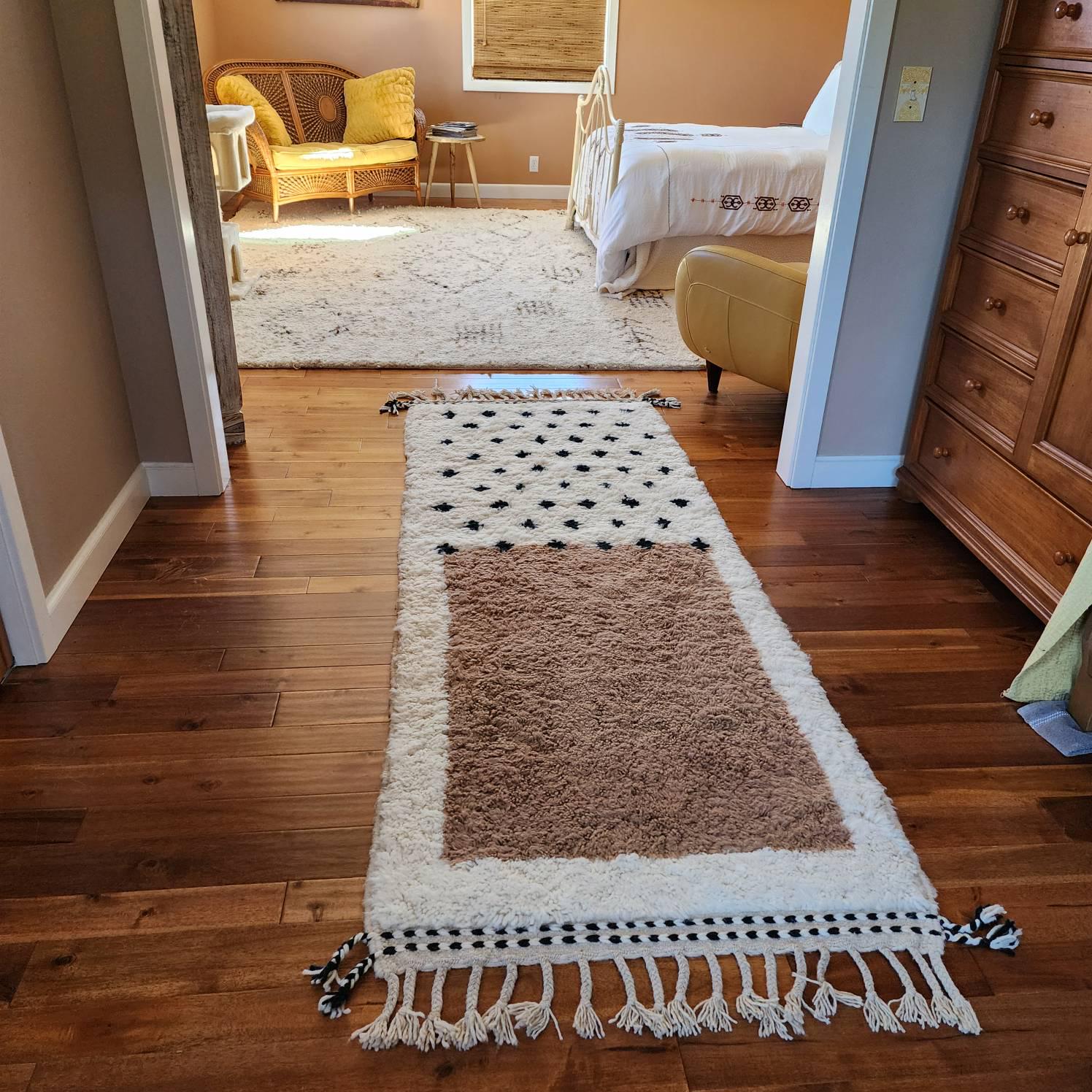 This beautiful and wonderful artistic berber wool brown and white runner rug is hand-woven by our artisan in the Atlas mountains, using techniques that are being passed from generation to generation. This Berber rug is from Ben Ourain tribe. We use undyed natural wool to decorate rugs with traditional dotted designs. These magnificent and sophisticated Moroccan rugs beautifully connect the ancient history of nomadic Berber tribes with modern-day interiors through fascination. Every rug is entirely handmade and then washed and dried in the mountain air. These rugs go perfectly well with all interior styles, including Traditional, Bohemian, Minimalist, Modern, and Scandinavian, making it the best choice for your needs. Beni Ourain rugs have also been featured on the cover of the world's leading home decoration .