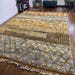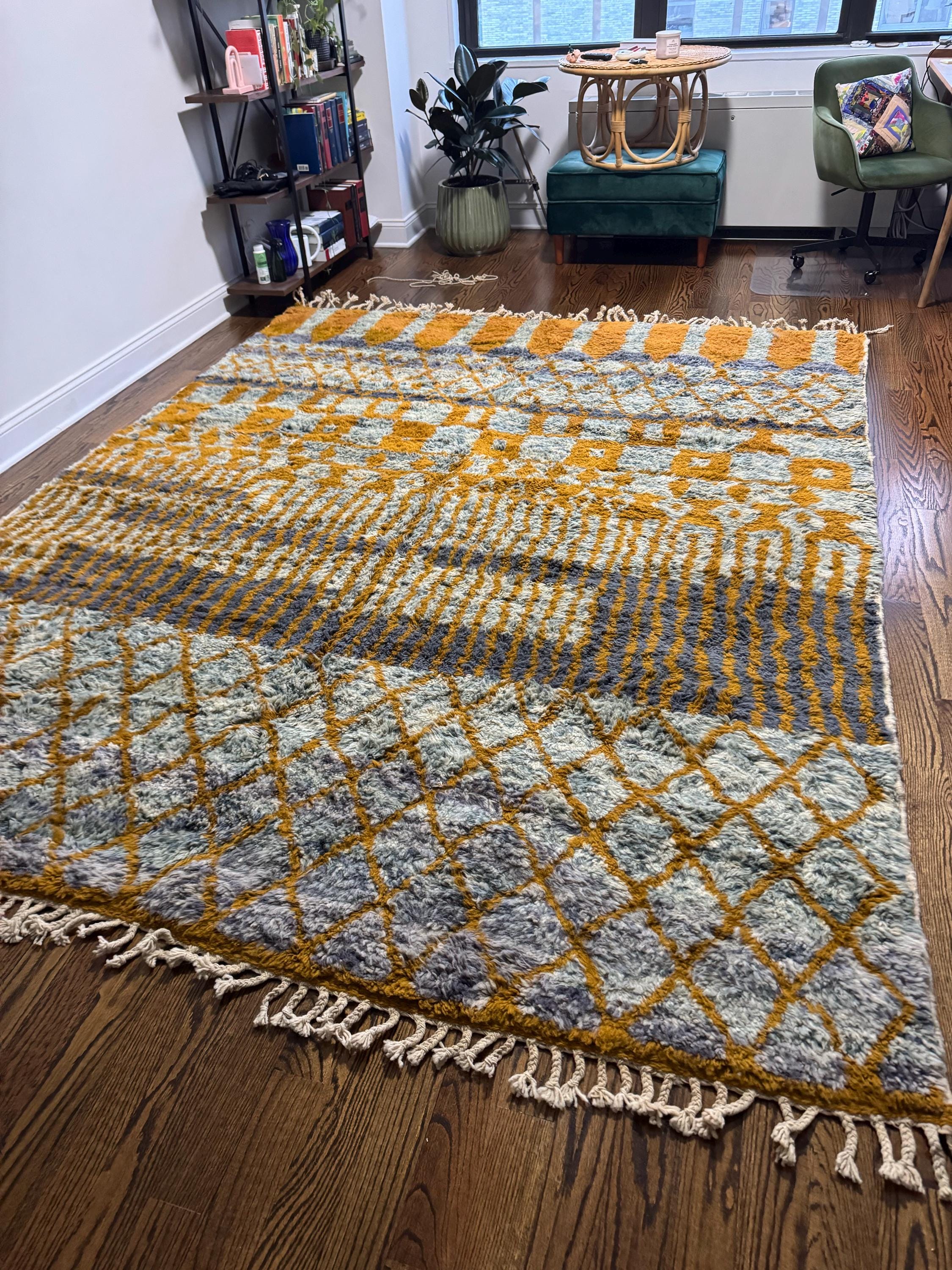 This unique Moroccan Berber mustard and blue rug is from Beni Ourain tribe. Each piece is a testament to the enduring artisanship of Moroccan weavers, skillfully handcrafted by our artisans in the High Atlas Mountains. Made from undyed natural wool and adorned with geometrical patterns, it brings the authentic spirit of Berber tribes into your home.